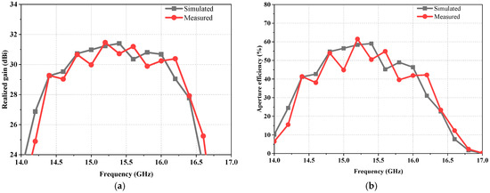 The gain of the manufactured antenna is shown in Figure 12a. As can be seen, the measured gains are higher than 29.9 dBi and the measured total efficiencies are better than 43% within the frequency band of 14.7~16.2 GHz. Meanwhile, the measured gain results show that the manufactured dual-band reflector antenna has a gain variation of less than 2 dB from 14.7 GHz to 16.2 GHz. The measured peak gain is 31.4 dBi, indicating an antenna aperture efficiency of 60.2% at 15.2 GHz, as shown in Figure 12b. Thus, the proposed dual-band reflector antenna can achieve high aperture efficiency and high gain with a low F/D of about 0.2. Moreover, the difference between the measured and simulated gains is less than 1 dB in the 14.7~16.2 GHz band.