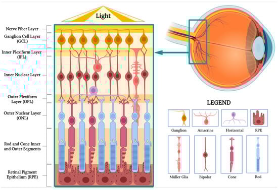 Retinal anatomy. The illustration highlights the different layers of the retina and its main cell types. (BioRender, https://app.biorender.com/, accessed on 16 February 2023).