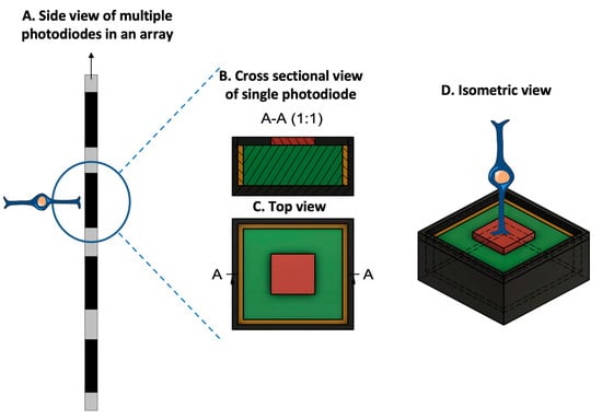 Prototypical design configuration of a photodiode, consisting of an inner electrode (red), a photodiode (green), an insulating layer (yellow), and an outer ground electrode (dark gray). (A. Side view of multiple photodiodes in an array. B. Cross-sectional view of the photodiode at position A-A, at the location specified in the top view. C. Top-orientation view of photodiode. D. Isometric view of the photodiode with a bipolar cell in close relation to the inner electrode. Due to the voltage drop between the inner and outer electrodes, the photodiode generates an electric field that can be used for cell stimulation. (Figure 4 was partly generated using Servier Medical Art, provided by Servier, licensed under a Creative Commons Attribution 3.0 Unported License.)