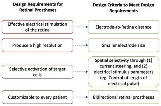 The performance of retinal prostheses is dependent on a few outcomes. Fulfilling these outcomes is important to drive their adoption in the market and by patients. These outcomes are (1) to provide effective electrical stimulation of the retina; (2) to produce a high-resolution image; (3) to selectively activate desired retinal cells, thereby avoiding image distortion; and (4) to be customizable for different patients. To achieve these requirements, retinal prostheses are designed with four main design criteria: (1) the electrode-to-retina distance, (2) having smaller electrode size, (3) implementing techniques to produce spatial selectivity, and (4) implementing bidirectional systems.