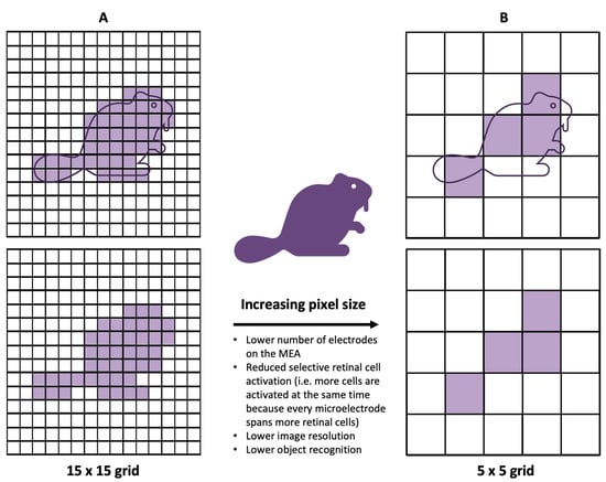 Demonstrating the impact of smaller electrodes. In comparison to the 15 × 15 grid (A), the 5 × 5 grid (B) produces a lower image resolution and enables less object recognition. Additionally, since each square in the grid represents the size of an electrode, having larger electrodes correlates to larger activation of retinal cells—i.e., less selective activation of desired, target retinal cells.
