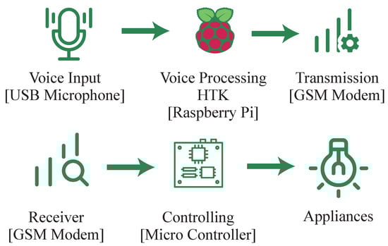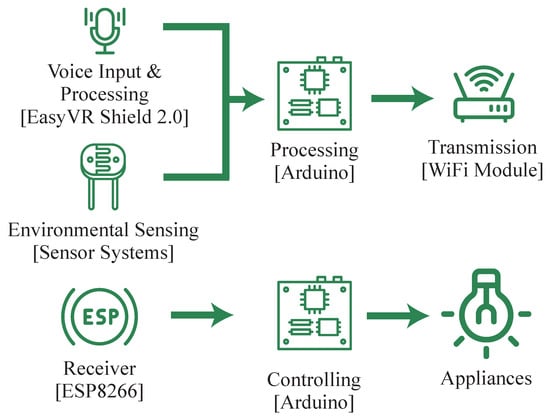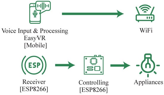 Elsokah et al., proposed a next-generation home automation system that is based on voice recognition and that uses an Easy VR 2.0 shield in combination with an Arduino microcontroller []. The overview of the system is shown in Figure 3. The system communicates between the hub and smart plug through a Wi-Fi module and has the added advantage of incorporating environmental inputs, such as humidity and temperature. However, the number of commands that can be executed is limited due to the use of the Easy VR shield.
