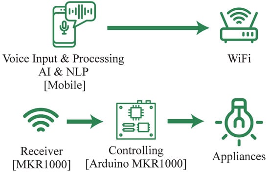 Rani et al. proposed a system that utilizes natural language processing (NLP) and uses a mobile phone for voice input and processing, as illustrated in Figure 4 []. The commands are then sent to the Arduino, that acts as a controller in a smart plug through Wi-Fi. However, a significant drawback of this system is its reliance on a mobile phone.