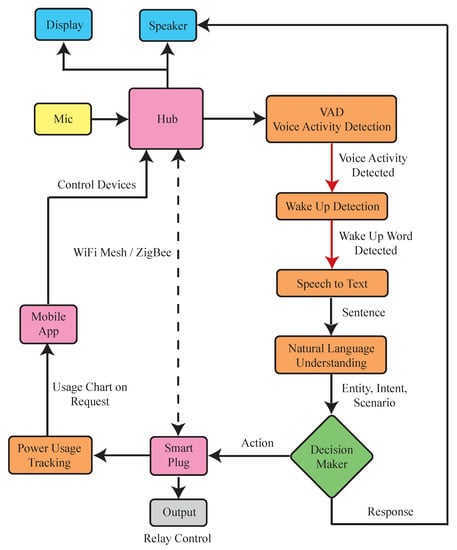 G. et al. [] proposed a method that employs the hidden Markov model toolkit (HTK) to convert speech into text. The overview of the system is shown in Figure 2. It uses a GSM module to transfer signals between the hub and smart plug via SMS. However, the HTK has limitations in terms of shorter time intervals that impacts performance. Natural language processing (NLP) is not utilized in this system either. In addition, the hub does not have an inbuilt microphone.