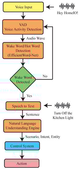 Figure 6 shows an overview of the speech recognition system used in HomeIO. The system consists of four components: a voice activity detection (VAD) model, a wake word detection model, a speech-to-text model, and a natural language understanding model. The VAD model has an algorithm that constantly monitors the surroundings for speech signals and uses VADs to identify speech segments with lower energy consumption. Upon detecting a voiced segment, the wake word detection model is triggered. If the wake word is detected, the speech-to-text model converts the audio signals into sentences. The natural language understanding engine determines the scenario, intent, and entity from the sentence. This is passed on to the control system to make a decision.