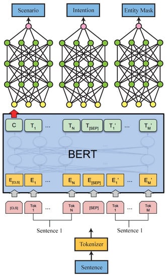 The input sentence must be translated into a machine-readable format for the smart hub to understand and execute the instruction. In the past, simple if-else statements were used to check for specific terms in the text, but these methods cannot capture key aspects, such as time, location, and intention. With advancements in NLP and ML, it is now possible to extract meaningful information from a sentence. Our system uses a pre-trained bidirectional encoder representations from transformers (BERT) model. The overview of this model is shown in Figure 8. It extracts the mask from the input sentence, that is then sent to an artificial neural network (ANN), that determines the scenario, intention, and entity from the input sentence [,]. An example of this would be the sentence “Turn off the light in the kitchen”, where the scenario is “IoT”, the intention is “Turn OFF”, and the entities are “Kitchen: location” and “lights: device”. These variables can then be used in control logic to perform the desired task. The model was trained using open-source data.