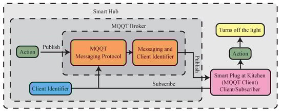 Message queuing telemetry transport (MQTT) is a standard IoT messaging protocol developed by the Organization for the Advancement of Structured Information Standards (OASIS). The overview of the protocol is shown in Figure 9. It is a widely used messaging protocol in the IoT field because of its simplicity and security features. It has a low overhead for both coding and network traffic. It uses transport layer security (TLS) encryption and authenticates clients using an open-standard authorization (OAuth) protocol to ensure secure communication between devices []. In the HomeIO system, MQTT will be used as the messaging protocol due to its ease of use and compatibility with the programming languages used in the smart hub and smart devices.