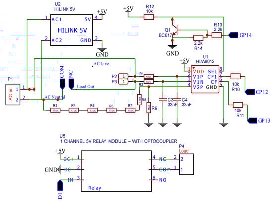 The smart plug socket uses the HLW8012 breakout board for energy measurement. A schematic and a printed circuit board have been designed for the smart plug socket, where all of the modules can fit in a small space. The schematic diagram of the smart plug socket is shown in Figure 10. The smart socket plug is designed to monitor the power usage when it is not connected to the hub, and to transmit the recorded data when it is connected to the hub.
