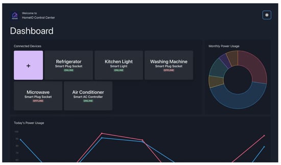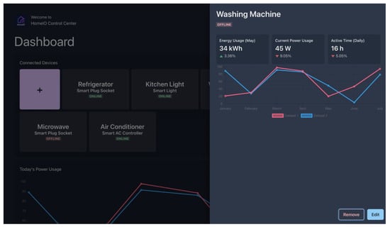 The system includes a dashboard created using ReactJS as the central interface for users to connect with the smart hub and smart plug socket. The interface of the dashboard is shown in Figure 11. Figure 12 shows the measured power usage data of a selected appliance. This dashboard serves as a tool for managing devices and monitoring them, and runs locally on the smart hub. It can be accessed from any device that is connected to the same Wi-Fi mesh network and provides the following user-friendly features to make the operation of the home automation system easier.
