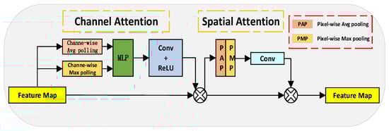 Secondly, considering the challenges faced by the C3 module in dealing with dense small targets in complex backgrounds, this paper incorporates the Convolutional Block Attention Module (CBAM) attention mechanism [17] into the existing C3 module, creating the C3_CBAM module as shown in Figure 2. Moreover, the structure diagram of the CBAM module is shown in Figure 3. The CBAM enhances the network’s response to crucial features by implementing spatial and channel attention mechanisms. The inclusion of CBAM allows the C3_CBAM module to strengthen the detection of small targets using channel attention, while spatial attention enables the model to focus on significant areas within complex environments, thus improving detection accuracy. Additionally, the module accomplishes efficient parallel computation by leveraging global pooling and convolution operations, meeting the demands for real-time drone target detection.