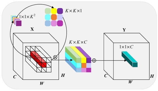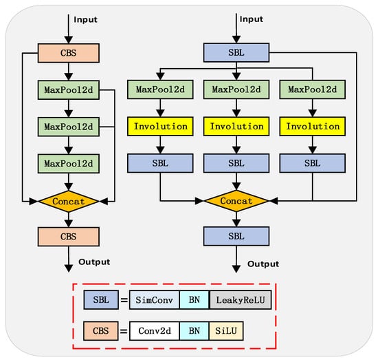 Initially, the parallel branch operations help alleviate the feature loss and error information propagation caused by serial pooling while enhancing the model’s efficiency. Second, the activation function is replaced with LeakyReLU, ensuring training stability and diminishing the computational burden. Furthermore, an involution structure is implemented to extract pixel information at specific scales. As a form of dynamic convolution, involution adaptively adjusts the weights of convolutional kernels to align with the input characteristics, effectively extracting specific scale information and addressing the challenges associated with substantial variations in target scale and difficulties in small target feature extraction. Specifically, the involution converts the input feature map into a 1 × 1 × k2 feature map via a 1 × 1 convolution. This feature map is then reshaped into a K × K × 1 convolutional kernel and applied to each channel of the input feature map, yielding a K × K × C feature map. The resulting feature map is further subjected to a 1 × 1 convolution operation to produce a 1 × 1 × K feature map.