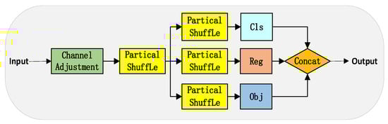 Initially, the input features undergo 1 × 1 convolution to reduce the channel dimension, which alleviates the computational complexity of subsequent operations. Next, before feature branching, a shared Partial Shuffle module is added, as shown in Figure 8. This addition obviates the need for independently and repetitively processing feature information in later branches, thereby further decreasing the model parameters. Finally, the Partial Shuffle module is utilized within the classification, regression, and object confidence branches. It takes advantage of the Partial Convolution [21] and draws on the Channel Shuffle design [22], both of which greatly diminish computational complexity while maintaining accuracy.