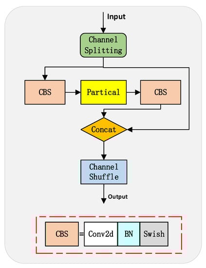 Partial Convolution applies filters to a part of the input channels, reducing redundant convolution computations and memory access and, thus, boosting computational efficiency. However, this restricts information exchange among channels. The structure of Partial Convolution is illustrated in Figure 9. Conversely, Channel Shuffle enables channel information sharing between adjacent network layers by reorganizing the feature map along the channel dimension. By establishing the interconnectedness of these two modules, the computational efficiency and feature redundancy reduction of Partial Convolution is maintained, while the correlation between the upper and lower channels is strengthened, thereby improving the model’s comprehension and utilization of features.