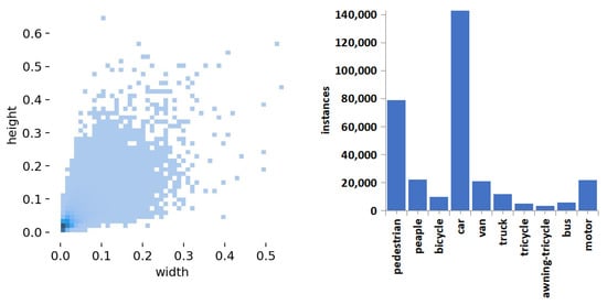 The present study utilizes the VisDrone2019 dataset [23], released by the AISKYEYE team at Tianjin University. This dataset encompasses all-weather data sourced from diverse environments in 14 Chinese cities captured by drones at various altitudes. After cropping and processing, the dataset produced 10,209 static images with resolutions ranging from 960 × 540 to 2000 × 1500, thus providing a comprehensive and extensive data source. These images are divided into 6471 training samples, 548 validation samples, and 3190 testing samples, collectively containing approximately 2.6 million target instances.