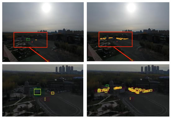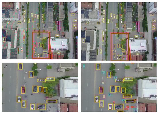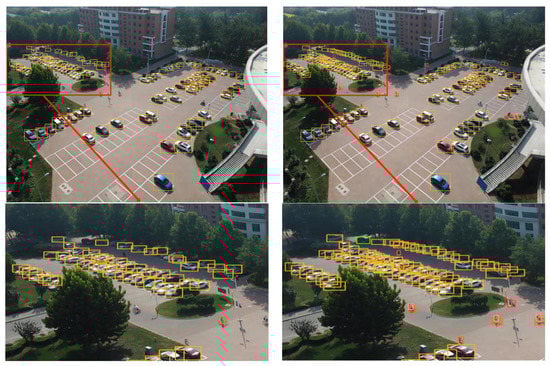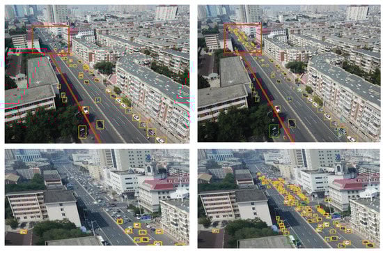 To further substantiate the effectiveness of the proposed algorithm, five sets of high-resolution images (with resolutions ranging from 1080 to 2000) from the VisDrone2019 dataset were selected. These images, characterized by complex backgrounds, dim lighting, small and densely-packed targets, and large target scales, were input into a model of size 640 for detection. The detection performance of various models is demonstrated in Figure 14, Figure 15, Figure 16, Figure 17 and Figure 18. The left side of each figure displays the results obtained by other algorithms, whereas the right side showcases the results yielded by the proposed MFP-YOLO algorithm. Despite these high-resolution images being resized to 640 for detection, which led to a further reduction in the target information, a comparative analysis of the detection results in Figure 14, Figure 15, Figure 16, Figure 17 and Figure 18 revealed: