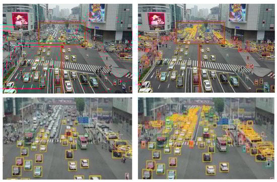 (2) The aerial image in Figure 15 is captured from a completely vertical perspective, which not only reduces target features but also diminishes target sizes, posing challenges for accurate detection. While the YOLOv3 network model can accurately detect most large-scale targets, it misses a substantial number of small-scale targets, such as pedestrians and cyclists. In contrast, the MP-YOLOv5 network model maintains accuracy in large target detection and successfully identifies smaller or more complex targets, such as pedestrians and obstructed vehicles.
