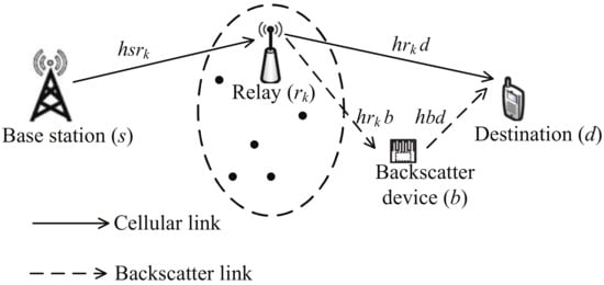 Consider a cooperative AmBC system with the coexistence of cellular and backscatter links [,], as illustrated in Figure 1. The cellular link employs opportunistic DF relaying transmission, while the backscatter link employs ambient backscatter transmission. The backscatter device (b) shares the same spectrum and receiver with the cellular link. The cellular link consists of a base station (s), K relays (), and a destination (d). Each node is equipped with a single antenna. We assume that there is no direct link between s and d due to obstacles. The wireless channel between node i (s, , ⋯, , b) and node j (, ⋯, , b, d) is modeled as an independent complex Gaussian random variable with zero mean and variance , i.e., . Thus, the channel gain follows exponential distribution with probability density function (PDF) . For analysis simplicity, we assume that all relays are located close to one another (optimal clustering) [,], which implies , , and , .