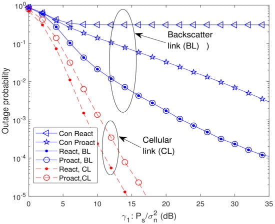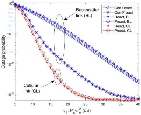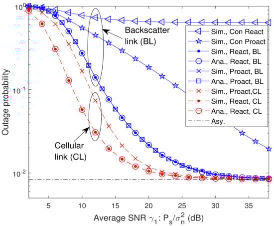 In Figure 3, we present the analytical and simulated OP versus average SNR for different relay selection schemes. In the legend, “Sim.”, “Ana.”, and “Asy.” denote the simulated results, the analytical results and the asymptotic results, respectively, and “React, BL”, “Proact, BL”, “React, CL”, and “Proact, CL” denote the OP of backscatter link for the reactive RSS (21), the OP of backscatter link for the proactive RSS (29), the OP of cellular link for the reactive RSS (25), and the OP of cellular link for the proactive RSS (32), respectively. Additionally, the labels “Con React” and “Con Proact” in these figures stand for the OP of backscatter link for the conventional proactive RSS, i.e., , and conventional reactive RSS, i.e., , where , respectively [,]. From Figure 3, it is observed that the analytical results match the simulation ones well. As expected, the OPs of backscatter link for both reactive RSS and proactive RSS are identical as indicated in Lemma 1. In addition, when , the OPs of backscatter link for both RSSs decrease with the increase of average SNR . At high SNR, the outage floor, whose value identical to the asymptotic OP at high SNR (42), occurs. The outage floor phenomenon can be interpreted as follows. From (9), the OPs of backscatter link for both RSSs depend on . According to (2)–(5), , , and are increasing functions of or . Since is fixed, i.e., is proportional to , the OP decreases with the increase of at lower SNR region. However, when increases further, tends to be stable in (4) which causes outage floor. Results also show that the reactive RSS is outage-optimal compared with the other single-relay selection schemes, which is consistent with Theorem 3.