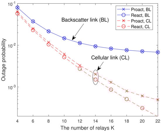 In Figure 4, we present the analytical and simulated OP versus the number of relays K with dB. As shown in Figure 4, the OPs of the backscatter link and cellular link for both RSSs decrease with the increase of K. The reason is that the more relays are available, the higher end-to-end SINR can be achieved. Thus, the outage floor can be reduced by increasing the number of relays.
