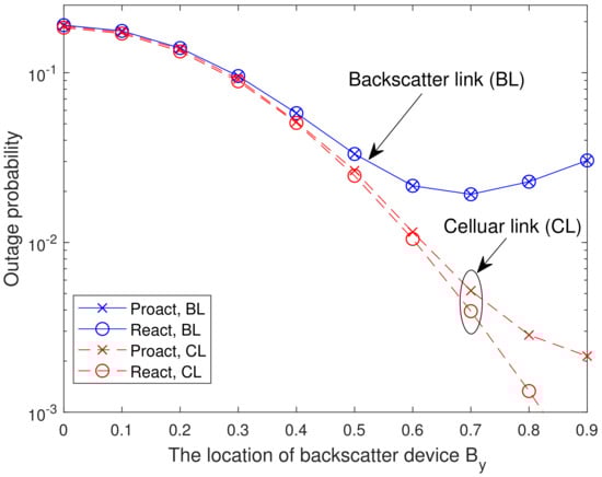 In Figure 5, we present the analytical and simulated OP versus the location of backscatter device with dB and . For the backscatter link, it can be seen that the minimum OP is attained when . This can be interpreted as follows. From (9), the OPs of the backscatter link for both RSSs depend on . By changing from 0 to 0.9, the dyadic backscatter channel quality, i.e., , becomes weaker and weaker, which in turn results in a larger and a smaller . When increases from 0 to 0.7, i.e., , the OP is limited by and the OP decreases with the increasing of . However, when increases further, i.e., , the OP is limited by and the OP increases with the increasing of . For the cellular link, it can be seen that the OP reaches to the maximum value at due to the strongest interference caused by the backscatter link at . This means that the BD cannot be located too close to the cellular users to avoid strong interference, nor can it be located too close to the cellular users to avoid sacrificing its own performance. Thus, for the BD, there is an optimal location where the BD and the cellular users can achieve a win-win situation.