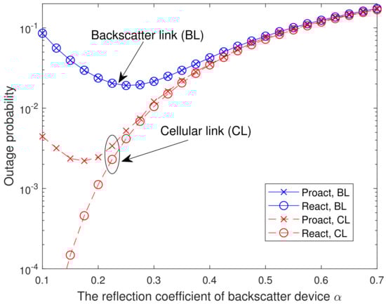 In Figure 6, we present the analytical and simulated OP versus the reflection coefficient of backscatter device with dB and . From Figure 6, it is observed that the OP of backscatter link decreases first and then increases with the increasing of . The reason is similar to the one provided in Figure 5. Furthermore, the OP of cellular link for the reactive RSS increases as grows. This can be interpreted as follows. According to (2) and (4), is independent of , whereas decreases with the increase of . Thus, as increases, the number of relays in the successful decoding set decreases, which leads to the OP deterioration. For the BD, a large reflection factor causes significant interference to the cellular users, but a small reflection factor leads to its own performance degradation. For the reactive RSS, there is an optimal reflection factor that enables both the BD and the cellular users to achieve good performance. However, for the proactive RSS, such an optimal reflection factor does not exist, and a trade-off between the BD and the cellular users is necessary to determine the value of the reflection factor.
