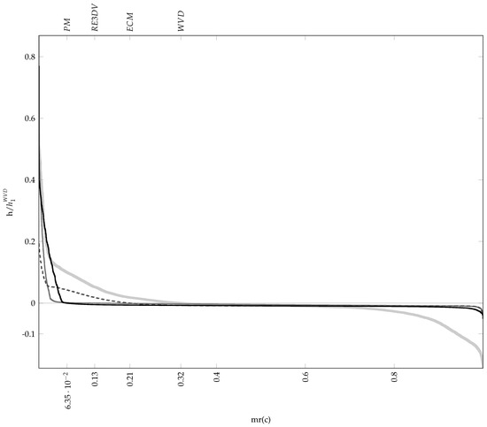 Since can be close to zero for nearly flat distributions or the WVD, is needed to discriminate higher concentrations further. However, and can promote cross-terms, so provides the counterbalance by only considering values greater or equal to , i.e., the significant auto-terms, as the principal concentration contributors. For the uniform TFD, , and all equal one, so it is uniquely ranked as the worst-performing TFD. On the other extreme, in the ideal TFD case, the p values are minimal, and it holds that .