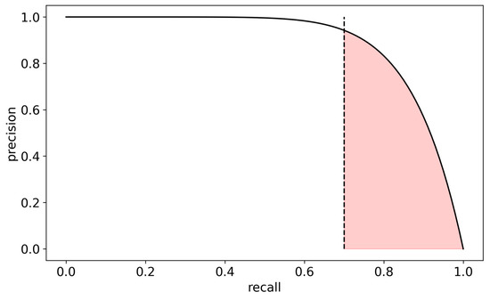 Definition of the AUC-PR-0.7 performance measure—the area (marked in red) under the precision–recall curve above 70% recall (dashed line). Precision is defined as the relative number of true alerts out of all alerts, while recall is defined as the relative number of alerted seizures out of all seizures.