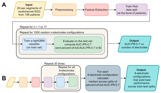 A flowchart depicting the major stages of the analysis: (A) determining the optimal number of electrodes, and the (B) systematic examination of all eight-electrode configurations. The colors of the flowchart symbols represent the processing stage; the text of identical processing stages was omitted from (B) for conciseness.