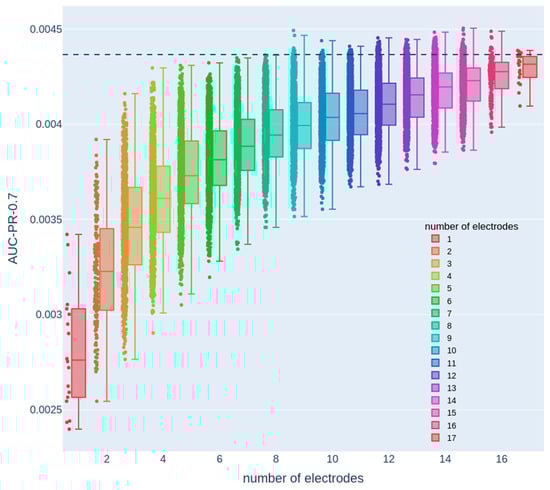 Dependence of the AUC-PR-0.7 measure on the number of electrodes. Each color denotes a different number of electrodes, and each dot represents the test set AUC-PR-0.7 of a model that only uses the features from a specific electrode configuration with the corresponding number of electrodes. The dashed line represents the AUC-PR-0.7 measure obtained from a model that uses features from all 18 electrodes.
