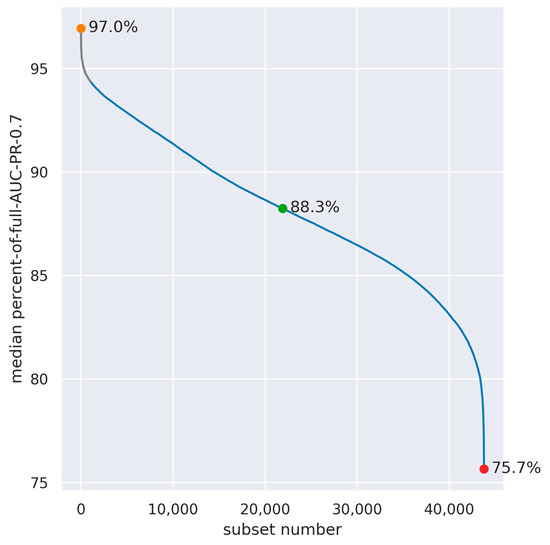 The full models, using all electrodes and features, yielded somewhat different performance values for each data split: AUC-PR-0.7 values ranged between 0.0032 and 0.0056 (0.0040 ± 0.0006; mean ± standard deviation), and AUC ROC values were between 0.86 to 0.9 (0.88 ± 0.01; mean ± standard deviation). Similarly, the electrode configurations that yielded the highest AUC-PR-0.7 were somewhat different among the different data splits. Therefore, to generalize the results across data splits, we used the median across data splits percent-of-full-AUC-PR-0.7 (see Section 2.6). Figure 4 depicts this quantity for all 43,758 eight-electrode subsets. Although performance was found to be varied on a wide range of values (from 75.7% to 97%), the top 1000 spatial configurations (marked in gray) were all above 94.4%, indicating that there is still substantial flexibility in the electrode layout.