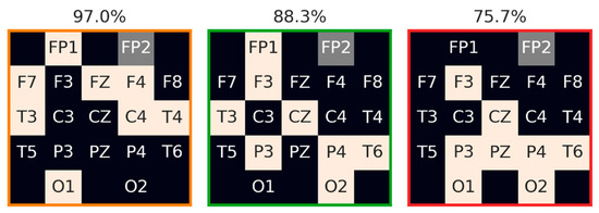 It is possible to evaluate the contribution of each electrode by examining its participation in the top subsets. However, separately examining the contribution of each electrode is an over-simplification, as it does not take into account the interactions between these electrodes; it is thus informative for the system design process to examine multiple configurations of eight electrodes, which provide a good performance, and then select the optimal configurations according to various design considerations. Figure 5 depicts three examples of these configurations—the highest, intermediate, and lowest, in terms of the median percent-of-full-AUC-PR-0.7 across the data splits.
