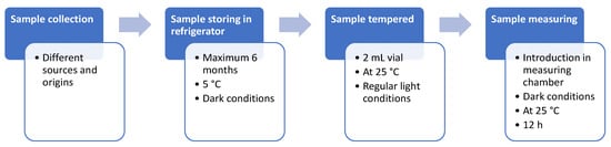 In addition, the blank was previously repeated in each data collection of each of the oils. Therefore, the complete elimination of the volatile compounds of the previous oil was ensured, avoiding interference in the responses of the sensors. Below is a simplified diagram of the methodology used to obtain the data (Figure 3).