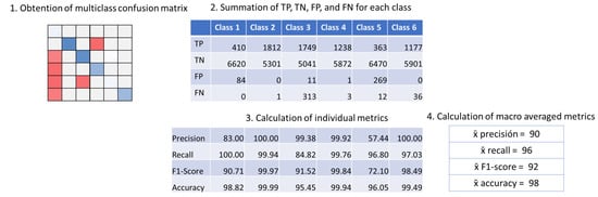 The metrics were then calculated for every single class (jclass), considering as: (i) TP, the number of cases correctly classified; (ii) FP, the number of cases classified as jclass belonging to other classes; (iii) FN, the number of cases of jclass classified as other classes; and (iv) TN, the number of cases from other classes classified as non-jclass. Then, the mean of the obtained metric was calculated for the six classes to calculate the macro-averaged metric. The macro-averaged metrics are the ones presented in the paper. In order to facilitate comprehension, a summary of the following process can be seen in Figure 4.