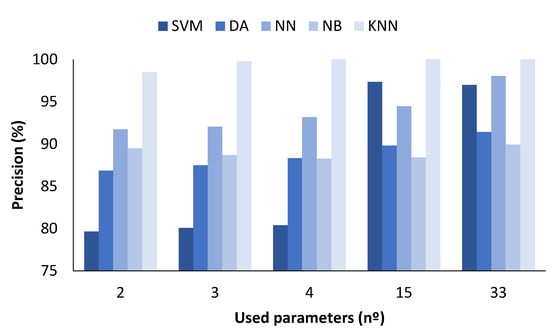 In Figure 5, the X-axis represents the number of parameters included in the classification algorithm, while the Y-axis indicates the attained macro-average precision. The results show the differences regarding the use of the different methods. The SVM method showed a higher precision when the number of parameters used was 15 or more, with a precision of 97.32 and 96.97%, respectively. For the DA method, the best results were also achieved for the number of parameters 15 or 33, with the value being 92.20 and 94.24%, respectively. Regarding the NN, a precision of 98.63% when the number of cases is 33 was attained. The best precision values for the NB ML algorithm were obtained when the number of used parameters were 2 and 33, with 89.49 and 89.95%, respectively. Finally, the method that showed the highest precision values for all cases was the KNN model. The precision was 90.75% for 2 parameters, 98.62% for 3 parameters, 99.90% for 4 parameters, and 100% for 15 or more parameters. Therefore, after analysing the precision results, we can conclude that the best model is the KNN model.