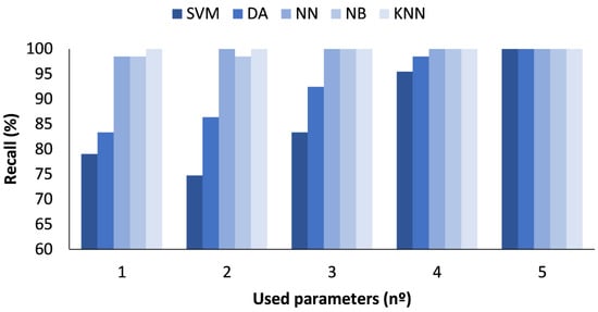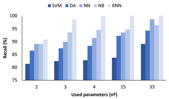 In Figure 6, the results for the different ML algorithms used are compared, and the results detailed below were obtained. First, the SVM had a lower recall, ranging from 81.36 to 89.08%, when the number of parameters used was 2 or 33, respectively. Concerning the DA, the recall was also higher when the number of parameters was 33, attaining 94.24%. The classification with the NN achieved a 98.63% recall when all parameters were used. For the NB algorithm, the recall was 96.39% when the 33 parameters were used as input information. Finally, for the KNN method, it presented a 100% recall for 15 or more parameters.