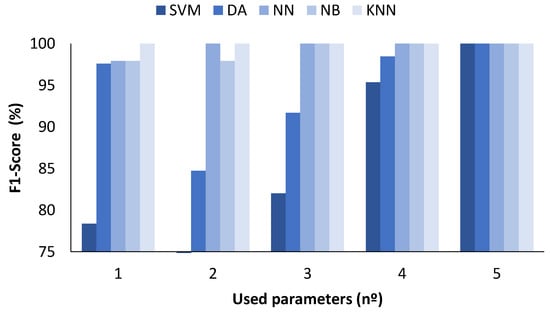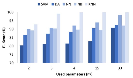 Figure 7 shows the results for the F1-score. The maximum F1-score for SVM ML algorithms was 90.80% and was achieved when the number of parameters was 33. Regarding the DA, the values are similar regardless of the number of parameters used, ranging from 86.54 to 92.44%. There is a clear difference regarding the NN algorithm when the number of parameters used was 33, which gave a value of 98.32% compared with the range from 90.08 to 93.94% when 2 to 15 parameters were used. The results with the NB are characterised by similar F1-score values independent of the number of parameters included, with maximum and minimum values of 89.26 and 92.10%, respectively. Finally, the KNN method was the one that attained the best performance. The F1-score was 92.80% for 2 parameters, 99.16% for 3, 99.94% for 4, and 100% for 15 and 33 parameters.