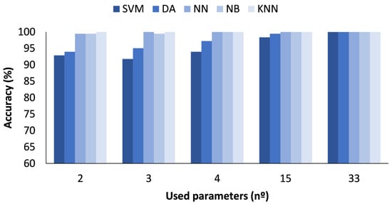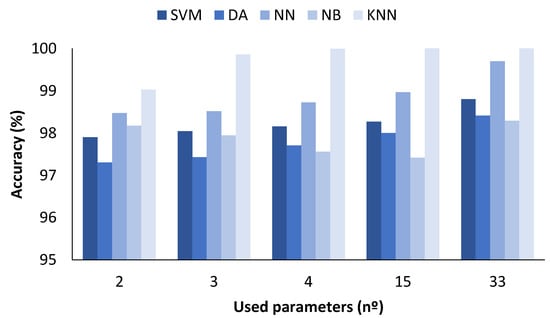The accuracy results for the different numbers of parameters used can be seen in Figure 8. The ML algorithms used present differences in terms of attained accuracy values. The best accuracy for the SVM ML algorithm was achieved when the number of parameters used was 33. The obtained accuracy for this case was approximately 98.80%. Regarding the DA ML algorithm, similar accuracies were attained regardless of the number of used parameters, ranging from 97.30 to 98.4% for 2 and 33 parameters, respectively. Concerning the results when the applied classification algorithm was NN, the obtained accuracy reached 99.69% when 33 parameters were used. The accuracy values for NB presented barely any variation independently of the used parameters, ranging from 97.42 to 98.29% for 15 and 33 parameters. In this case, the accuracies for the 2 and 33 parameters were almost identical. Finally, with the KNN algorithm, the achieved accuracies were the best, with 100% accuracy for 15 and 33 parameters, 99.99% for 4 parameters, 99.85% for 3 parameters, and 99.02% for 2 parameters.