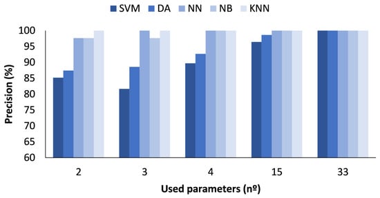 Figure 9 displays the summary of macro-averaged precision for the different classifications. The obtained precisions ranged from 81.17 to 100%. The worst case corresponded to the classification performed with SVM using 3 parameters. With all employed ML algorithms, 100% precision was obtained when all parameters were used. Three ML methods attained 100% precision with fewer parameters, particularly NB with 4 and 15 parameters; KNN with 2, 3, 4, and 15 parameters; and NN with 3, 4, and 15 parameters. The precision within the case with the most limited number of parameters was 85.17% for SVM, 87.43% for DA, 97.62% for NB, 97.62% for NN, and 100% for KNN, respectively.