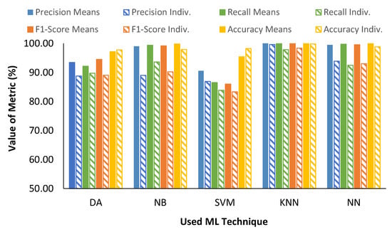 The following aspect to be considered is the suitability of using individual data or the hourly mean data for classification. The macro-averaged metrics for each ML algorithm combining the different number of parameters divided into individuals (Indiv.) or mean data can be seen in Figure 13. In most cases, the use of hourly mean data implied the attainment of better performance in the studied metrics. Remarkably, the highest differences were for NB and NN, in which cases the use of individual data supposes a decrease in metrics performance of up to 5% compared with the metrics obtained with hourly data. A decrease of 3% in the metrics performance was found in DA when the individual data were used. The differences were minimum for SVM and KNN, the latter of which had a lower decrease and very similar precision and accuracy values. Finally, we should highlight the case of the DA and SVM, in which the use of individual data produced an increase in accuracy. Thus, we can affirm that in all the cases, the use of averaged hourly data is preferred. Nonetheless, individual data can be used considering the possible future requirements for fast classification. When individual data should be used, selecting the KNN algorithm to classify the samples is preferred.