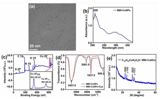 The TEM of Figure 2a shows that the prepared MBI-CuNPs have a regular shape, uniform distribution, and a particle size of about 1.7 nm. In Figure 2b, the UV-Vis absorption peak of the MBI-CuNPs is located at 208 nm, indicating that there is no large aggregation of CuNPs because the absorption peak of CuNPs is related to the particle size of CuNPs [28,29,30]. Figure 2c shows the elemental composition of the MBI-CuNPs, in which S, C and N are provided by MBI and Cu is provided by CuSO4 in the MBI-CuNPs, while the O element comes from the PVP adsorbed on the CuNPs. In the inset of Figure 2c, the peaks of Cu 2P3/2 and Cu 2P1/2 are located at 931.28 eV and 951.08 eV, respectively, with an energy gap of 19.80 eV, which shows that CuNPs are composed of Cu(I) [30,31]. In Figure 2d, the absorption peaks at 3457.6, 2080.0 and 1637.9 cm−1 are the vibrational of the O–H bond in the water molecule adsorbed on the PVP, the C-H bond on the benzene ring of MBI, and the C=O double bond on the PVP, respectively [32,33,34]. The absorption band at 509.2 cm−1 corresponds to the vibrational absorption of the S–Cu bond and N–Cu bond formed by MBI and Cu(I) [35]. Compared with the FT-IR spectra of MBI-CuNPs, the vibration of MBI-CuNPs+Cys decreases at 2081.0 cm−1, which may be due to the electrostatic interaction between Cys and MBI weakening the vibration of the C–H bond on the benzene ring of the MBI. In addition, the peak strength of MBI-CuNPs+Cys at 509.2 cm−1 remains basically unchanged, which indicates that the S–Cu and N–Cu bonds still exist after adding Cys to the MBI-CuNPs. The XRD of the MBI-CuNPs are shown in Figure 2e. The diffraction peaks at 23.3°, 25.2°, 32.1° and 33.9° are (220), (−120), (023) and (−131) crystal planes of ethylamine butylcopper (C10H24CuN2OS) (JCPDS, 31-1626), respectively, which is consistent with the molecular formula C7H6N2S of MBI, while Cu comes from the CuNPs, and the excess C, H, and O elements may come from the PVP. It shows that MBI is coordinated with monovalent copper, which is consistent with the FT-IR determination results of the MBI-CuNPs in Figure 2d.