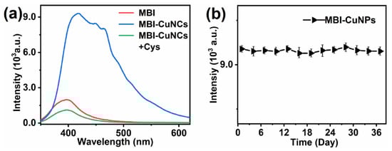 The fluorescence of MBI, MBI-CuNPs and MBI-CuNPs+Cys were measured under 200 nm excitation at room temperature (25 °C). Figure 3a shows that MBI only exhibits weak fluorescence at 395 nm, while the MBI-CuNPs probes exhibit strong fluorescence emission at 415 nm. This may be due to the formation of the charge transfer transition between MBI and monovalent copper in the MBI-CuNPs, thus improving the fluorescence quantum yield of the MBI-CuNPs. In addition, the fluorescence of the MBI-CuNPs was significantly quenched after reacting with 65 µM Cys for 2 min, which could be used for sensitive and rapid detection of Cys. This is attributed to the fact that the fluorescence peak of the MBI-CuNPs probe is located in the violet region. It has the characteristics of high energy, strong penetration and low light decay performance in solution, which makes the MBI-CuNPs probe show as being highly sensitive to Cys [23,24]. Figure 3b shows that the fluorescence properties of the MBI-CuNPs probe are stable within 37 days and can be used for practical detection.