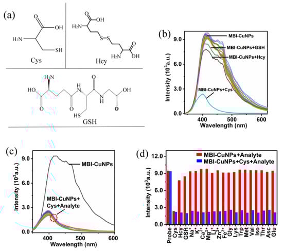 (a) The structure diagram of Cys, Hcy and GSH. (b) Selective detection of Cys by the MBI-CuNPs. (c) Competitive detection of Cys by MBI-CuNPs probe. (d) Fluorescence intensity at 415 nm for each spectrum in (b,c).