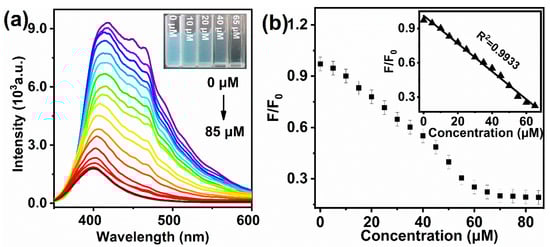 The fluorescence responses of MBI-CuNPs probes to Cys (0–85 µM) were studied, and the Cys concentrations were 0, 0.05, 5, 10, 15, 20, 25, 30, 35, 40, 45, 50, 55, 60, 65, 70, 75, 80 and 85 µM, respectively. As shown in Figure 5a, the MBI-CuNPs probes are highly fluorescence dependent on Cys, and the inset shows that the color of the solution disappears significantly after the reaction between MBI-CuNPs and Cys, indicating that MBI-CuNPs have an obvious fading reaction with Cys. Figure 5b shows that the fluorescence quenching rate F/F0 of the MBI-CuNPs probe has a good linear relationship with the Cys concentration Q of 0.05–65 µM. The linear fitting relationship is F/F0 = −0.0122 Q + 1.0124, and the correlation coefficient R2 = 0.9933. The detection limit (LOD) (LOD = 3δ/k, n = 10) of MBI-CuNPs for Cys is 52 nM.