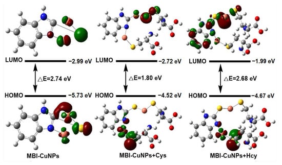 Frontier molecular orbital of MBI-CuNPs, MBI-CuNPs+Cys and MBI-CuNPs+Hcy.