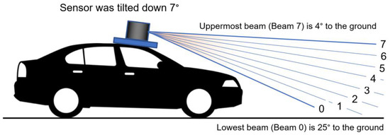 The M8 sensor has eight laser beams providing a 360° horizontal and 20° vertical field of view [14,15]. The measurement technique used in this sensor is time-of-flight (TOF) with a frame rate of 5 Hz to 20 Hz. In default mode, the M8 sensor spins at 10 Hz, and the laser fires at a constant rate of 53,828 Hz. To avoid any interference among the lasers, the lasers are fired in the sequence 0, 4, 2, 6, 1, 5, 3, and 7, where the Beam 0 is the lowest, downward-looking plane, and the Beam 7 is the highest as shown in Figure 2. The sensor returns angle, distance, intensity, and a synchronized timestamp for each sample. The intensity is stored as an unsigned 8-bit byte value where 0 is the lowest intensity, and 255 is the highest intensity. Note that this is not directly interpretable in the typical units of retroreflectivity but rather should be considered a relative measure. The sensor was positioned at the top of the roof of the test vehicle and tilted down 7 degrees to maximize the frontal road scanning as shown in Figure 2.