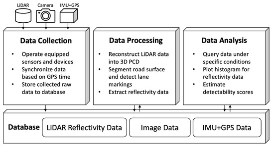 A software system was developed to collect and analyze the lane-marking data obtained from all the vehicle sensors. The system consists of a database and three programs for data collection, processing, and analysis. Figure 3 shows the overall structure of the system.