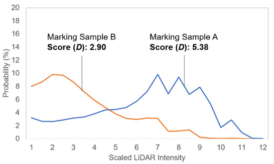 In general, the lane-marking intensities fall into a range of 30 to 50, while the full range of the intensity for the M8 LiDAR sensor is 0 to 255 (8 bits, i.e., one byte). Markings are typically detected based on the retroreflectivity discrepancy between the road and markings, so higher intensity values represent greater detectability. Figure 5 compares the processed intensity distributions of two-lane markings. Both markings have similar ranges of intensity distribution (Marking A: 27 to 50, Marking B: 27 to 49), but marking A outperforms marking B in terms of detectability due to the greater percentage of points at higher intensity values, indicating that the marking is effectively “brighter” to the sensor. Thus, the detectability performance of a marking should be assessed by considering both the intensity range and the proportional amount of higher intensity values.