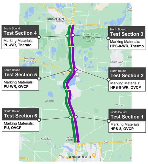 On the US-23, this material was installed in the pavement marking on test sections 1, 2, 5, and 6 with the recessed-marking method. Figure 6 shows the test sections on a map, and Appendix A summarizes the matrix of pavement-marking materials and properties for each test section.