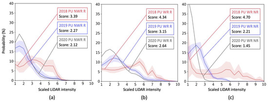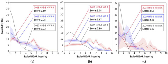 Figure 7 shows longitudinal changes over three years in intensity distributions of the polyurea markings. All the data under the same conditions, such as material type, measurement angle, and weather condition, were gathered for each year (2018: red, 2019: blue, 2020: black). The highlighted areas in each color show ±1 standard deviations of the data, and solid lines represent the mean intensity distribution. Note that only a few drives were performed in 2020, so standard deviations were not computed.