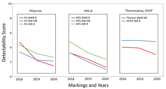 For non-wet-reflective and recessed polyurea markings in test section 6, the detectability deterioration appears more significant for the polyurea when a marking is newer. Over the first year (2018–2019), the detectability score was degraded by 1.12, while the second year (2019–2020) had a relatively small score reduction of 0.15. For wet-reflective and recessed polyurea markings in test section 5, similarly, the first year had a larger decreasing rate in detectability score than the second year for the non-wet-reflective polyurea. In the first two years, the score decreased by 1.19, while the reduction in the score was 0.51 between the second and third years. For wet-reflective polyurea markings installed on a non-recessed surface, the material showed the steepest detectability degradation in a year, as expected. In the first year, the score dropped by 2.49. This is a 2.1-times larger decrease rate than the score drop for the same material on a recessed surface. In the second year, the intensity decrease rate was also larger for the non-recessed polyurea markings. The detectability score dropped by 0.76, compared to the score decrease (0.51) for the recessed polyurea marking, but the difference was not bigger than the first two years.